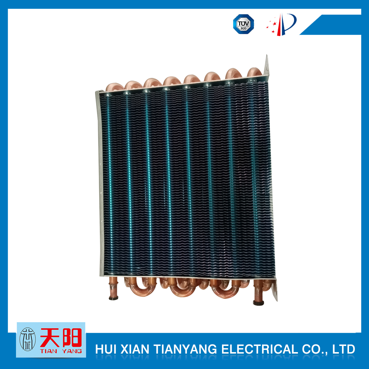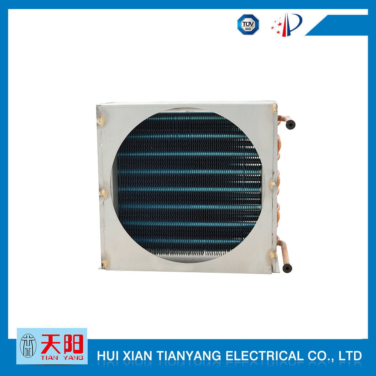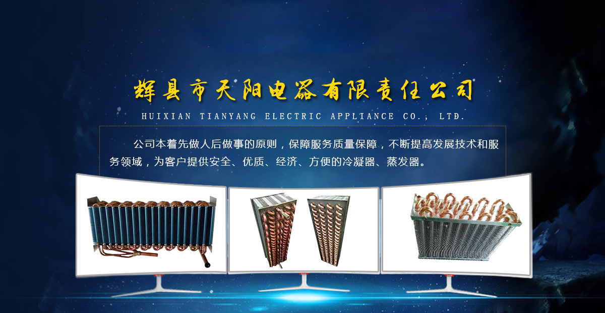 輝縣天陽電器有限責任公司位于肥沃的中原河南省輝縣市學院路中段工業集聚區興業園3號廠房,以制冷設備用冷凝器,蒸發器,熱交換器為主。主要材料為銅管鋁翅片,銅管銅翅片,鋁管鋁翅片。廣泛應用于冰箱冰柜,制冷設備,暖通設備,空調,自動售貨機,冷干機,超市立風柜,冷藏車,烘干機等產品領域?! 」咀?998年成立以來,始終堅持:“科技造就產業、質量成就信譽、誠信鑄就輝煌”的質量方針,從產品拓展上堅持“人無我有,人有我優,人優我特的”經營理念,25年來,從1998年開始供應河南冰熊集團下屬的冷柜廠,制冰機廠各種冷凝器;2003年之后,原冰熊集團的精英志士開始在全國各地發展,所到之處依托我公司供貨,以致于多家目前已具行業中佼佼者的公司,從而建立了如凱雪公司,兆邦公司、凌云公司、海寶公司、正雪公司、上海忠云、山東德萊維等幾十余家公司在草創時期的啟蒙供貨商,友好共贏長達十余年,成為我國制冷行業的供應商。以致在2015年初雙匯集團面向社會的招標書中指名要我公司冷凝器、蒸發器指定產品供應商