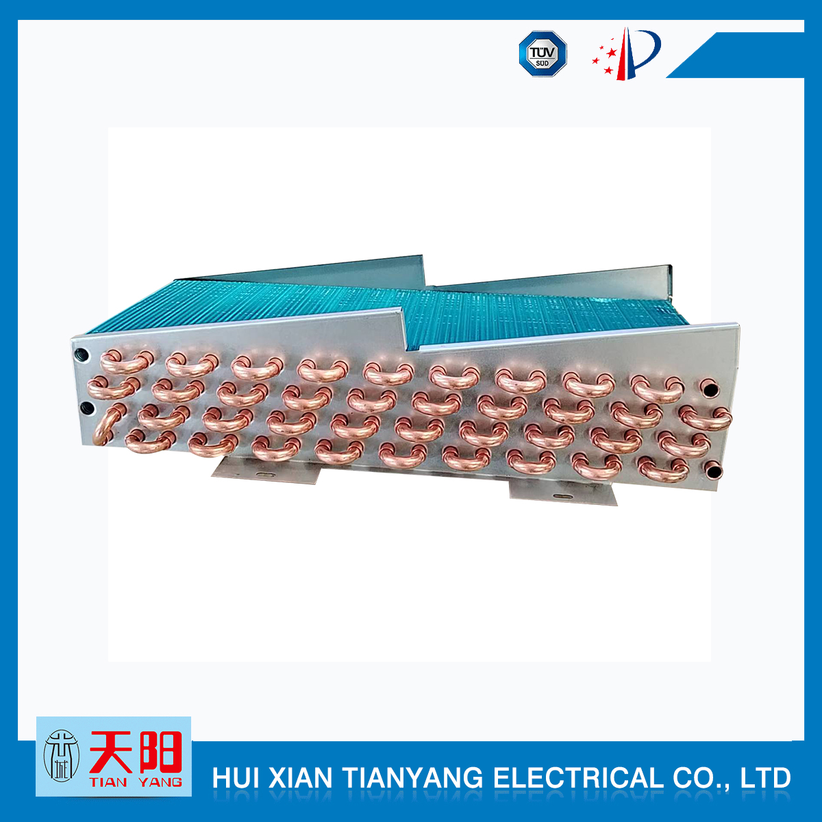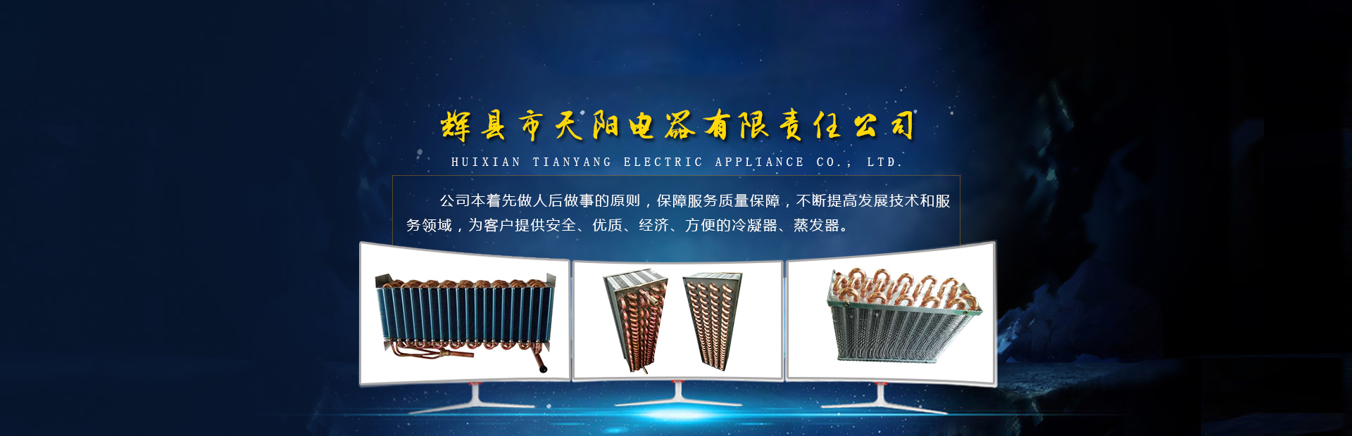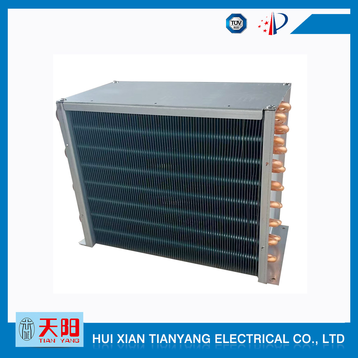 輝縣天陽電器有限責任公司位于肥沃的中原河南省輝縣市學院路中段工業集聚區興業園3號廠房,以制冷設備用冷凝器,蒸發器,熱交換器為主。主要材料為銅管鋁翅片,銅管銅翅片,鋁管鋁翅片。廣泛應用于冰箱冰柜,制冷設備,暖通設備,空調,自動售貨機,冷干機,超市立風柜,冷藏車,烘干機等產品領域?! 」咀?998年成立以來,始終堅持:“科技造就產業、質量成就信譽、誠信鑄就輝煌”的質量方針,從產品拓展上堅持“人無我有,人有我優,人優我特的”經營理念,25年來,從1998年開始供應河南冰熊集團下屬的冷柜廠,制冰機廠各種冷凝器;2003年之后,原冰熊集團的精英志士開始在全國各地發展,所到之處依托我公司供貨,以致于多家目前已具行業中佼佼者的公司,從而建立了如凱雪公司,兆邦公司、凌云公司、海寶公司、正雪公司、上海忠云、山東德萊維等幾十余家公司在草創時期的啟蒙供貨商,友好共贏長達十余年,成為我國制冷行業的供應商。以致在2015年初雙匯集團面向社會的招標書中指名要我公司冷凝器、蒸發器指定產品供應商